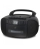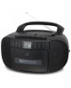 This boombox lets you listen through built-in speakers to radio (AM/FM), CD, Cassette, or aux in. The simplistic design makes it easy for all ages to use and enjoy with Programmable Tracks and Repeat One or All Play, and even records radio or CD to cassette.